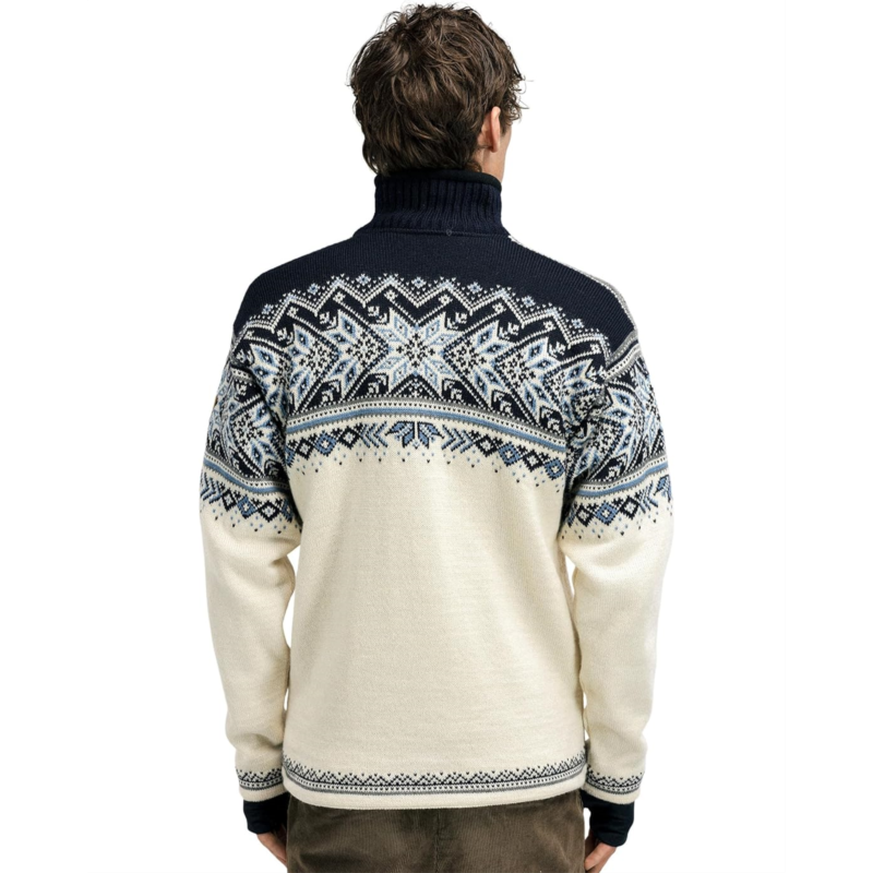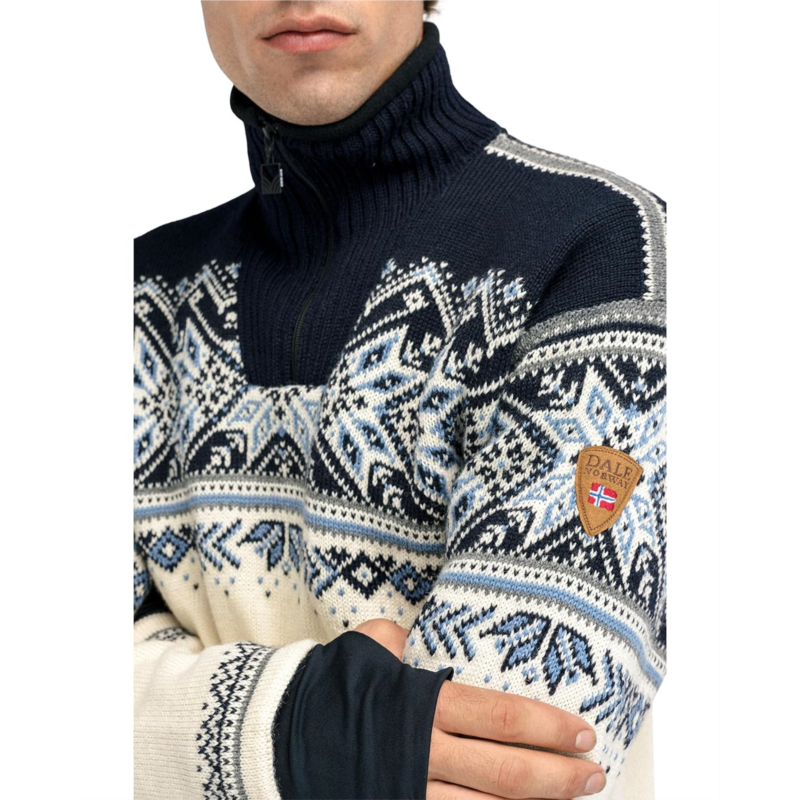 - A knit sweater in traditional winter sports styles to suit an active lifestyle, the Dale of Norway Vail WP Masc Sweater features a detailed 8-petal rose pattern with decorative winter elements. It is made from lightweight and long-lasting wool with premium knit quality for maximum comfort, softness, and strength. This warm and breathable woolen sweater comes with a windproof lining and is water-resistant. The quarter-zippered front placket, long sleeves, a med-high neckline, and a straight hem add to its style and comfort. Its stand collar is lined with fleece for added warmth. Ideal for both indoors and outdoors, this patterned sweater keeps warmth in and allows moisture to escape to keep you warm and dry all day.