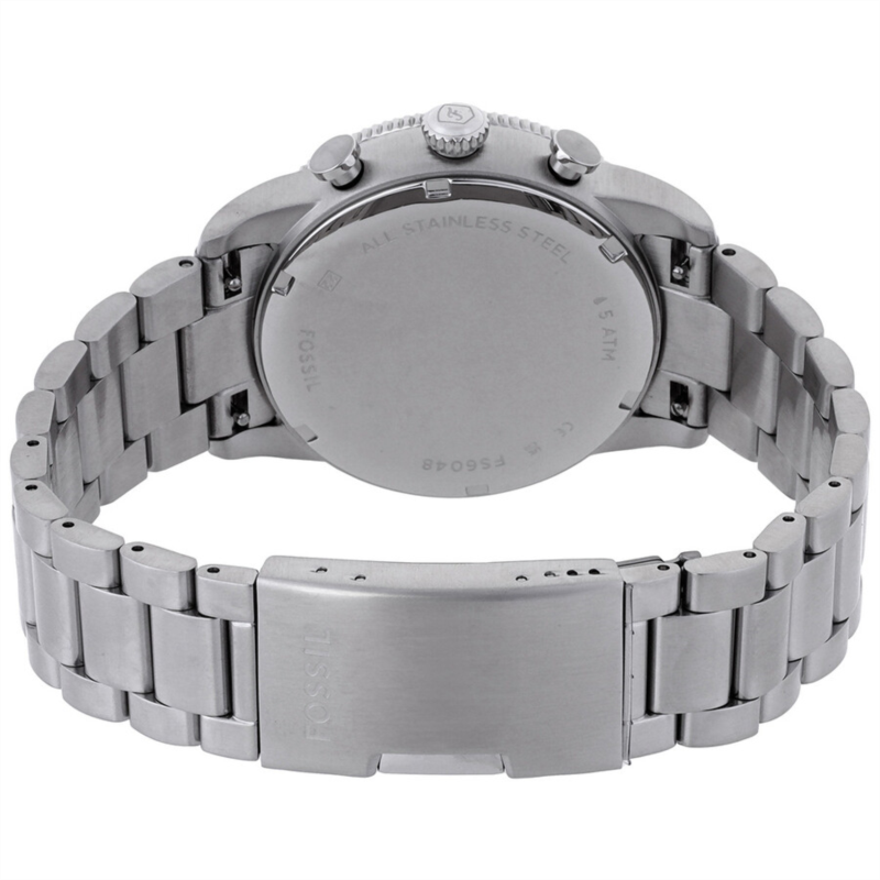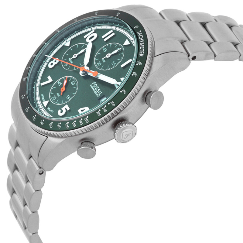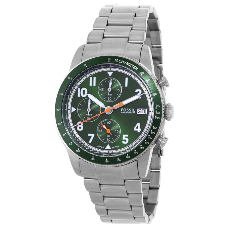 Silver-tone stainless steel case and bracelet. Fixed tachymeter scale green stainless steel bezel. Green dial with silver-tone hands and Arabic numeral hour markers. Minute markers around the outer rim. Dial Type: Analog. Luminescent hands and markers. Date display at the 3 o''clock position. Chronograph - three sub-dials displaying: 60 second, 60 minute and 12 hour. Quartz movement. Scratch resistant mineral crystal. Pull / push crown. Solid case back. Round case shape, case size: 42 mm. Band width: 22 mm. Fold over clasp with a safety release. Water resistant at 50 meters / 165 feet. Functions: chronograph, date, hour, minute, second. Sport Tourer Series. Sport watch style. Fossil Sport Tourer Chronograph Quartz Green Dial Men''s Watch FS6048.