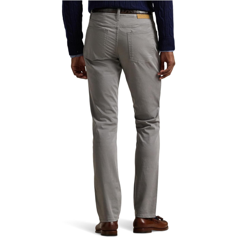 - Step into the venue, exuding both style and sophistication in the Polo Ralph Lauren Varick Slim Straight Stretch Sateen Pants. These come in a straight-leg silhouette with a regular rise and a trim fit through the thigh that relaxes from the knee down. The pants feature belt loops, a zip-fly & button closure with a metal button custom-developed with a Ralph Lauren logo, and five-pocket styling. The metal rivets are similarly custom-developed with a PRL 67 logo. Plus, the leather Polo Ralph Lauren patch at the back right waist and the signature embroidered Pony at the coin pocket make the apparel look more genuine.