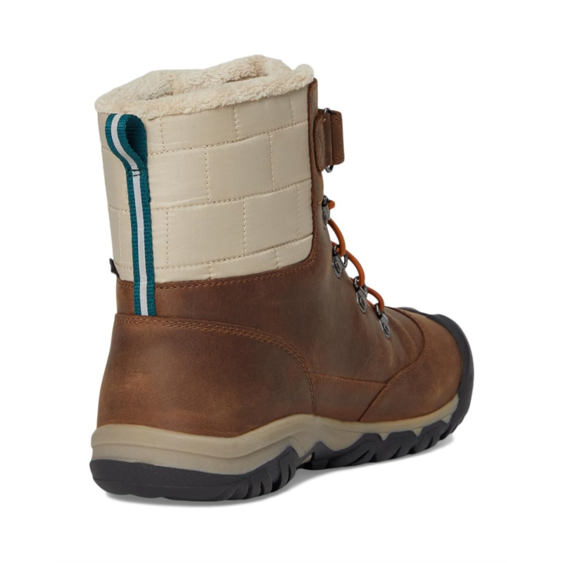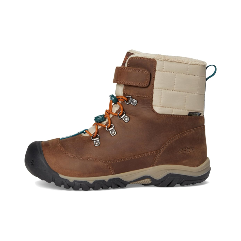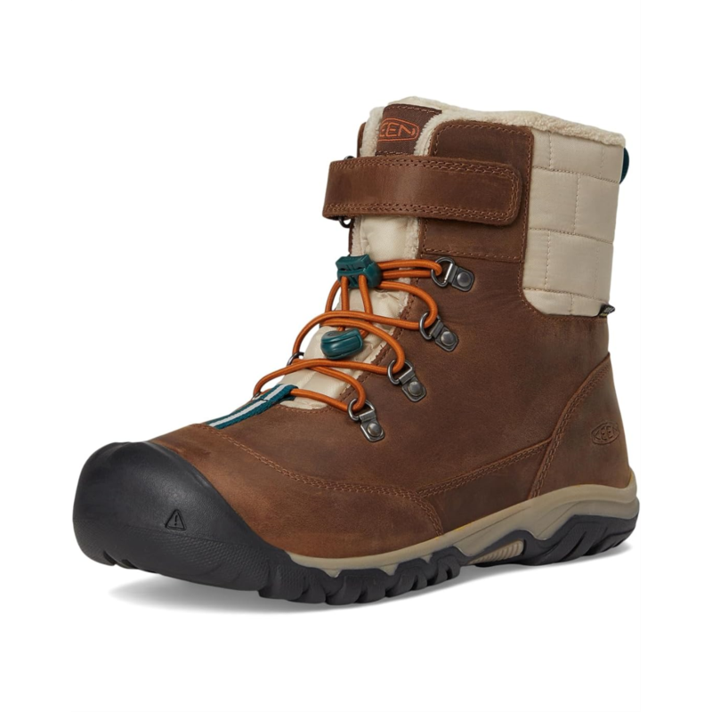 - The KEEN Kids Kanibou Waterproof boots are the perfect mixture of style, support, and warmth. Their 200 grams of KEEN.WARM insulation and a Thermal Heat Shield insole will keep your kiddos feet warm through all kinds of winter play. These snow boots for kids are built on KEENs traditional wider footwear form. The KEEN.DRY waterproof, breathable membrane helps keep your kids feet dry and comfortable while jumping in puddles and walking in mud. These ankle-high boots are made of a leather upper and mesh lining. Their bungee laces and a hook-and-loop strap ensure a secure fit.