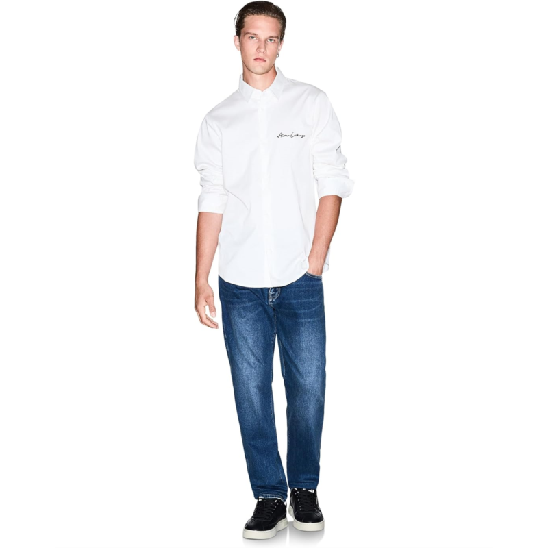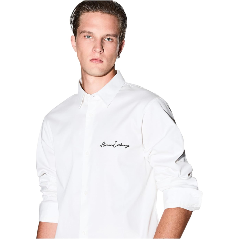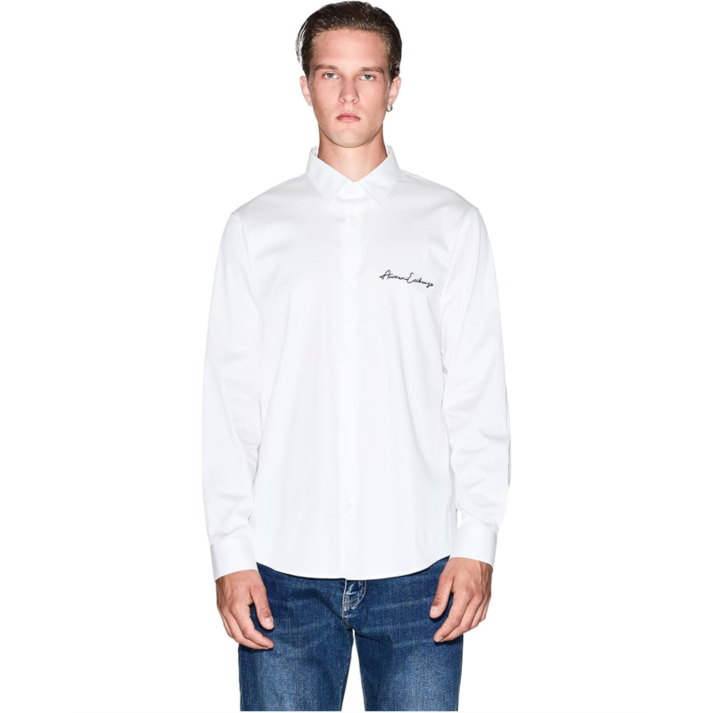 - The Armani Exchange Script Logo Button Down shirt is a wardrobe essential. Made from a cotton blend, it feels soft and luxurious. It features a collared neckline, a buttoned front closure, and a signature AIX Logo on the chest.