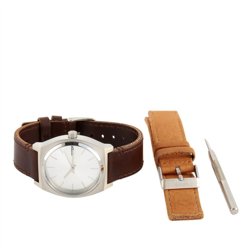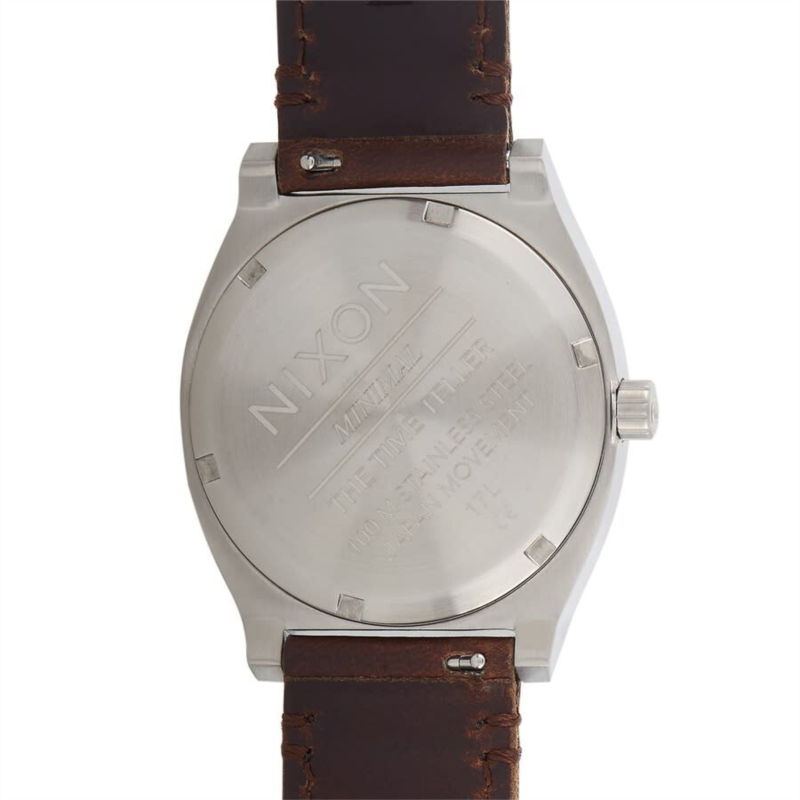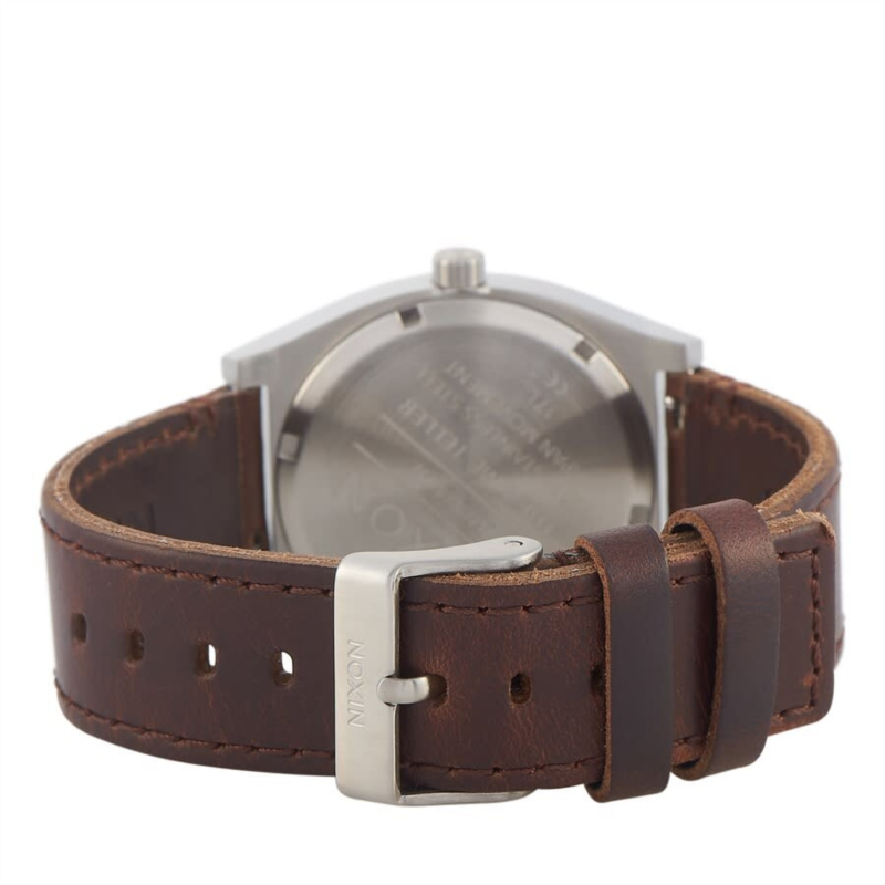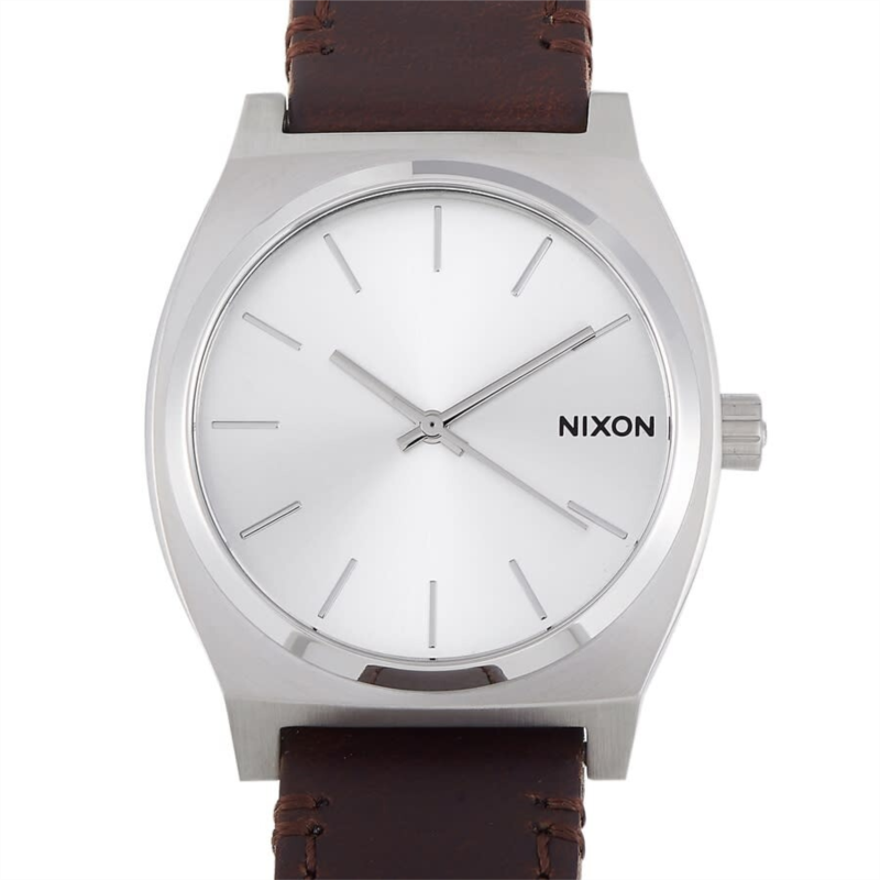 Stainless steel case with a brown leather strap. Fixed stainless steel bezel. Silver dial with silver-tone hands and index hour markers. Dial Type: Analog. Quartz movement. Scratch resistant mineral crystal. Pull / push crown. Solid case back. Round case shape. Case size: 37 mm. Case thickness: 9 mm. Band width: 19.5 mm. Tang clasp. Water resistant at 100 meters / 330 feet. Functions: hour, minute, second. Time Teller Series. Dress watch style. Nixon Time Teller Quartz Silver Dial Ladies Watch A1137-2872-00.