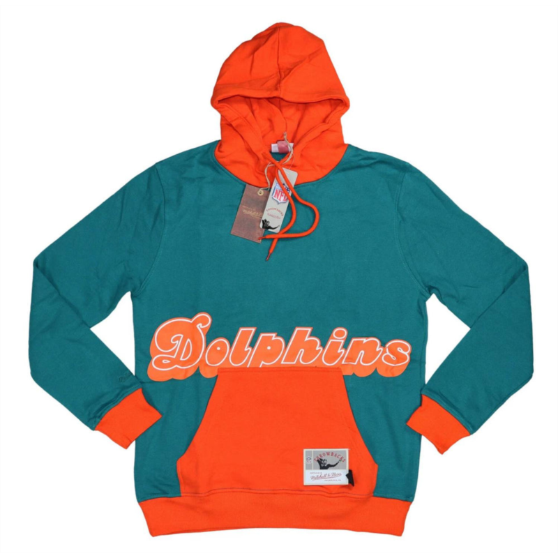 Stay stylish and cozy this fall with the Mitchell & Ness Mens Miami Dolphins NFL Throwbacks Hoodie Sweatshirt in vibrant green and orange. Designed with long sleeves and made from a high-quality blend of 80% cotton and 20% polyester, this regular fit pullover hoodie boasts a hooded neckline with a drawstring and a front kangaroo pouch for added convenience. Featuring an oversized throwback team logo, it’s a perfect choice for game day or streetwear enthusiasts. Closure is a pull-on style, and it is machine washable for easy care.