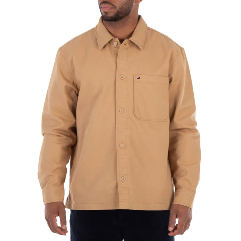Tommy Hilfiger Mens Outerwear. Fashion category - Coats & Jackets. SKU - MW0MW35818RBL. Color - Khaki. Tommy Hilfiger Twill Relaxed Fit Shirt Jacket. This shirt jacket is crafted from breezy pure cotton twill and features a button-through closure for versatile wear, a semi-spread collar, a chest patch pocket with Tommy Hilfiger flag embroidery, and signature Tommy Hilfiger branding. 100% cotton.