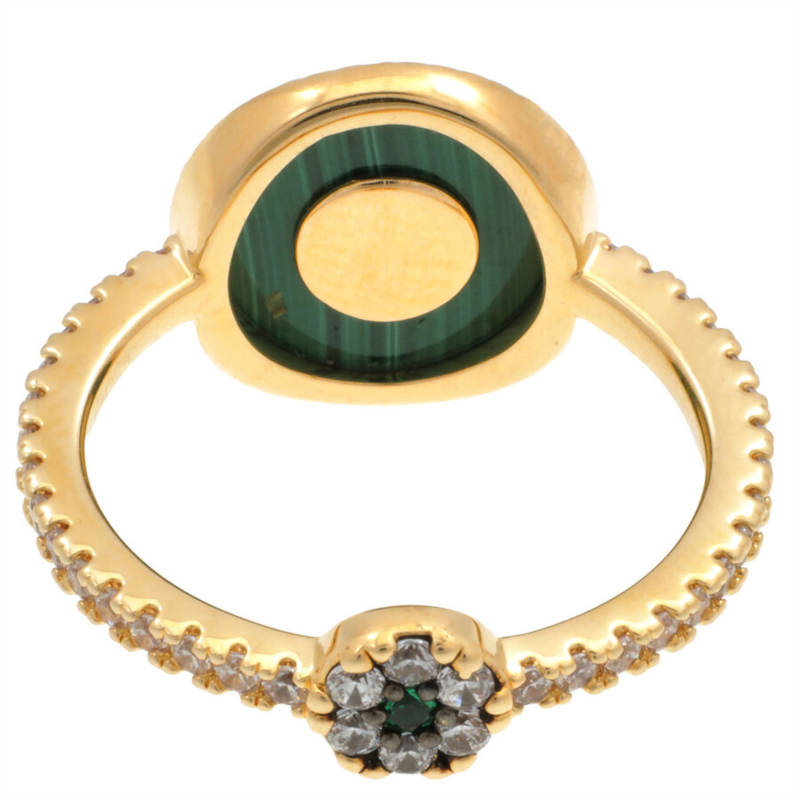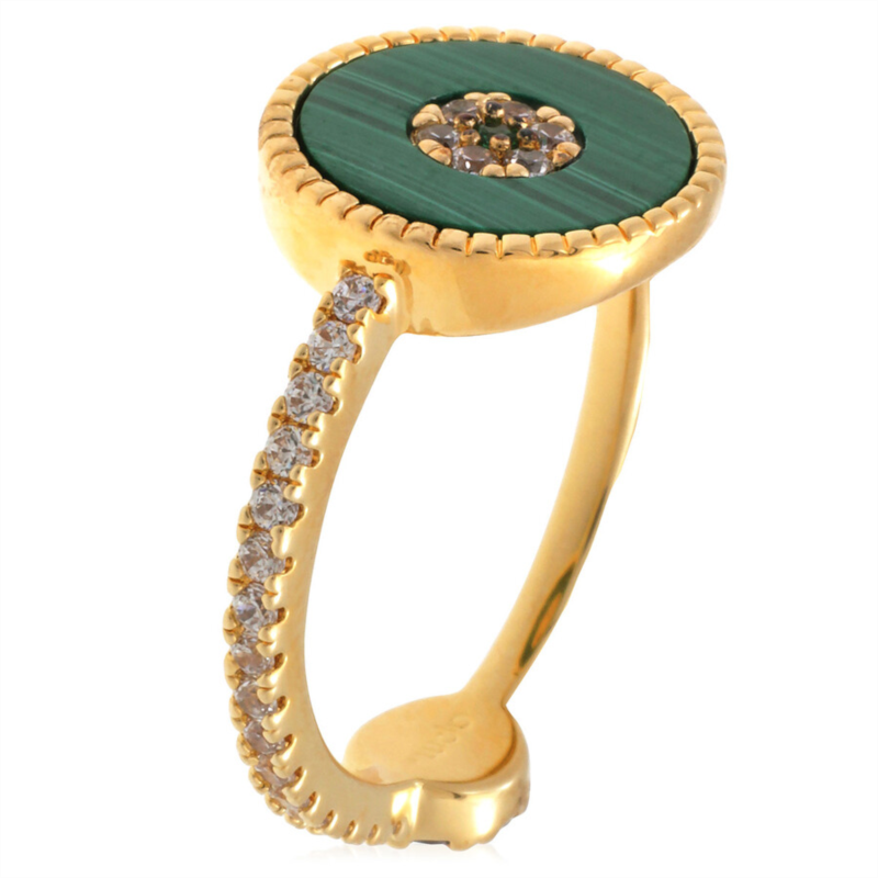 APM Monaco Ladies Rings. SKU: Y22143XMAL. Color: Yellow Gold. APM Monaco Lucky Eye Ring. This ring is crafted from APM Yellow Alloy with an 18k gold-plated layer of 3 microns, microset with white cubic zirconia and green nanos, and adorned with malachite. Material: APM Yellow Alloy made of 95% recycled material and 18k gold plated (3 microns), malachite, green nano, white cubic zirconia, anti-tarnishing and anti-allergenic. Authentic APM Monaco item. Packaging may vary and may not include the original branded gift box.