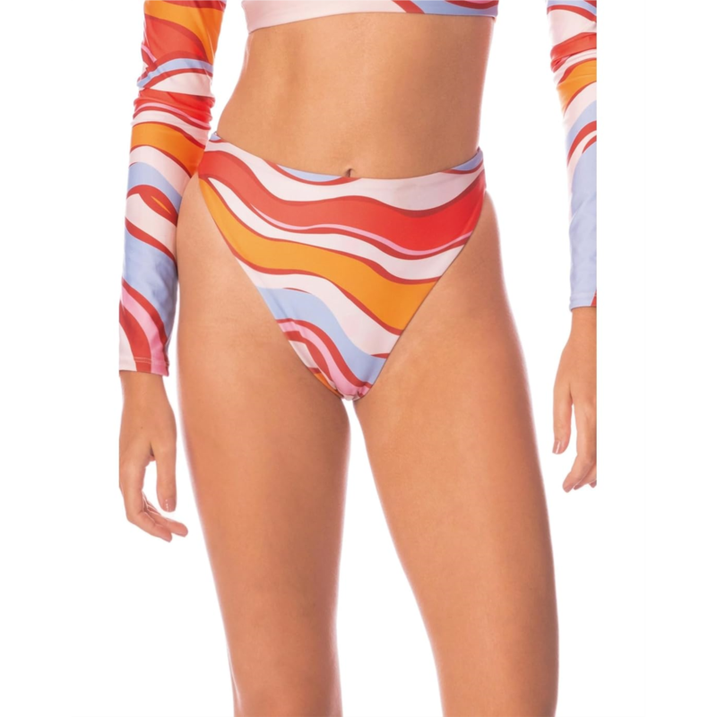 Effortlessly dazzle in vibrant hues wearing the Maaji Swizzle Blossom Yuki Bikini Bottoms. The pull-on bottomwear features a high-rise waist and high-leg silhouette with colorful wavy print pattern designed allover.