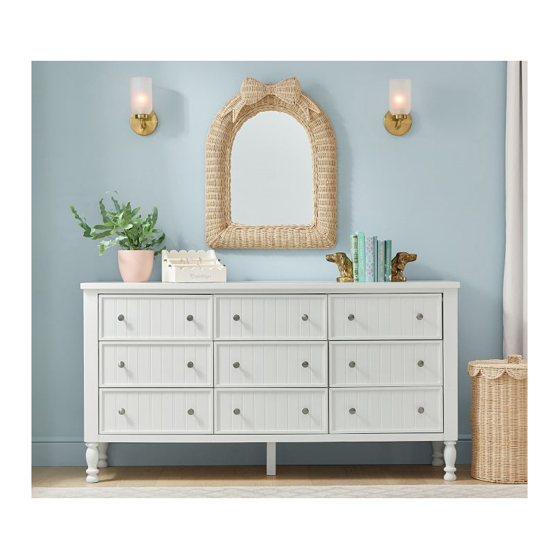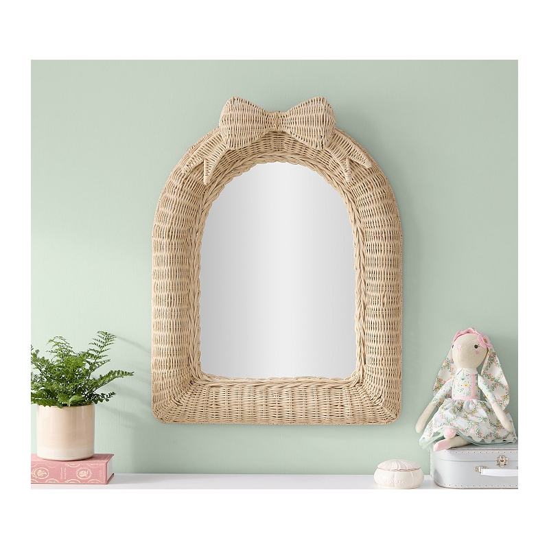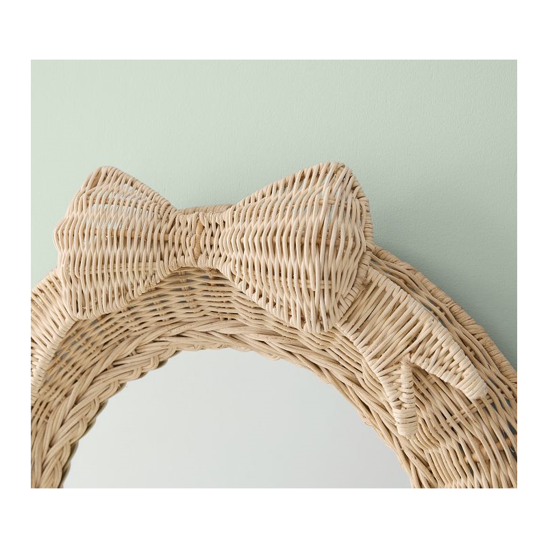 Topped with a sweet bow, our rattan mirror adds a lovely flourish to their space. A natural complement to any decor, the rattan is woven around an iron frame for enduring strength and given a natural finish. Slight variations in color and finish are hallmarks of time-honored weaving techniques.