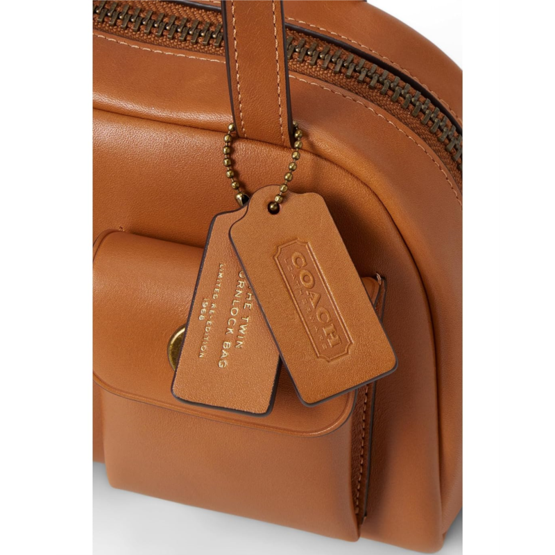- The COACH Twin Turnlock Bag 20 is a hand-carry bag with four protective feet at the base for convenient carrying. Made from waxed smooth leather, this luggage bag is designed with dual grab handles and a zippered top closure. With its two outside turnlock pockets, an interior compartment, and an inside snap pocket, this leather bag offers enough space for all your essentials.