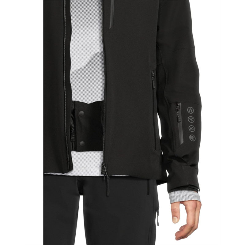 - Two zippered hand pockets, a zippered chest pocket, a zippered ski pass pocket on the left sleeve, an interior zippered pocket, and an interior mesh pocket.