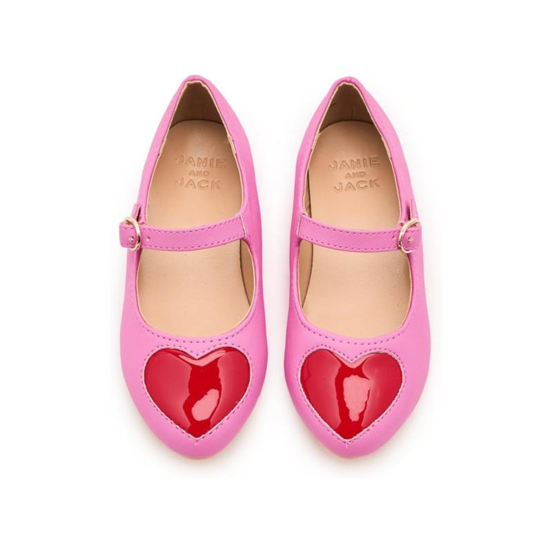 - The Janie and Jack Patent Heart Flats feature a sweet heart accent at the toe that adds a whimsical touch. A classic round toe silhouette ensures comfort, while the adjustable buckle strap offers a secure fit.