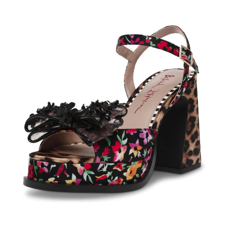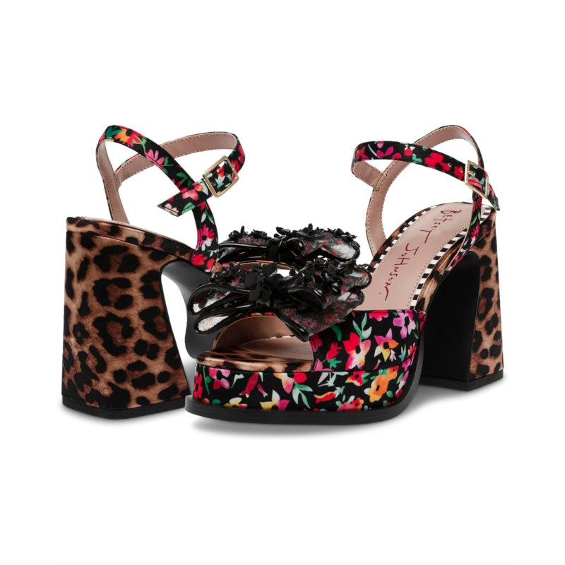 Step into bold and playful style with the Blue by Betsey Johnson Lilie sandals, where fashion meets fun in a striking design. These bold sandals feature a chunky sole and an oversized bow adorned with tiny flower appliques at the toe, creating a dynamic and eye-catching look. The platform square toe and floral-printed angled block heel add a touch of retro flair while providing comfort and stability.