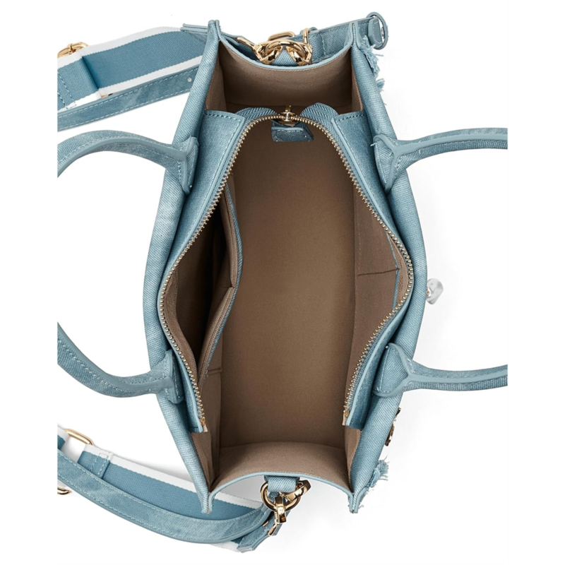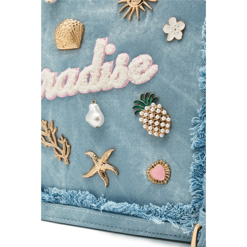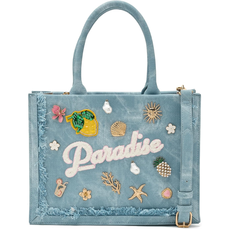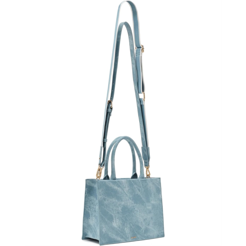 - Carry your casual style and look classy carrying the ALDO Paradisetotee. This denim tote bag is perfect for travel, with its sturdy material and playful embellishments. Crafted from polyurethane upper, this bag features zippered closure, two shoulder straps, detachable and adjustable crossbody straps, one interior main compartment, and one slip pocket.