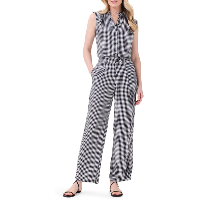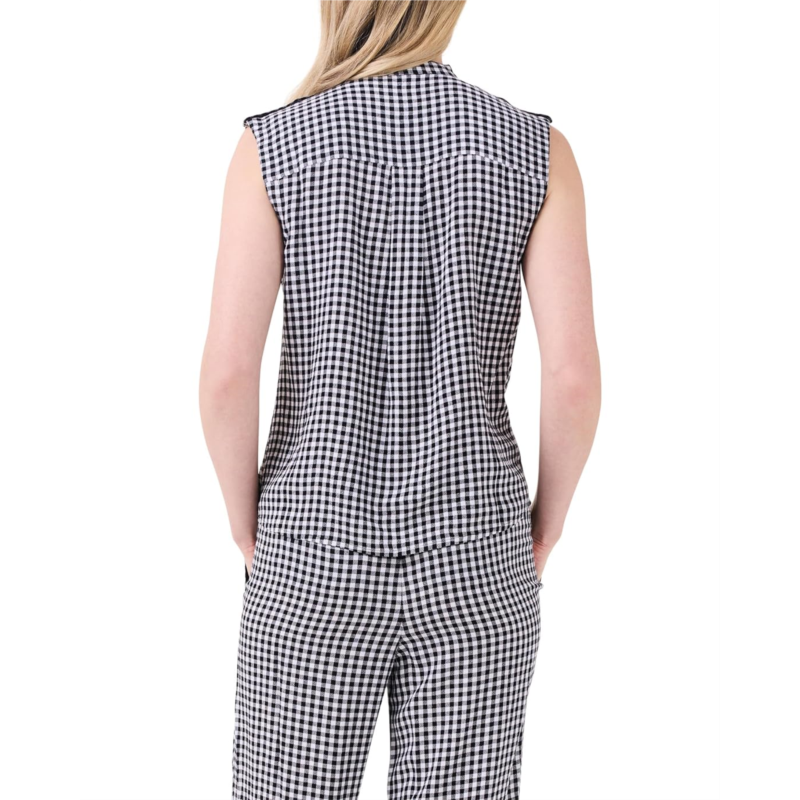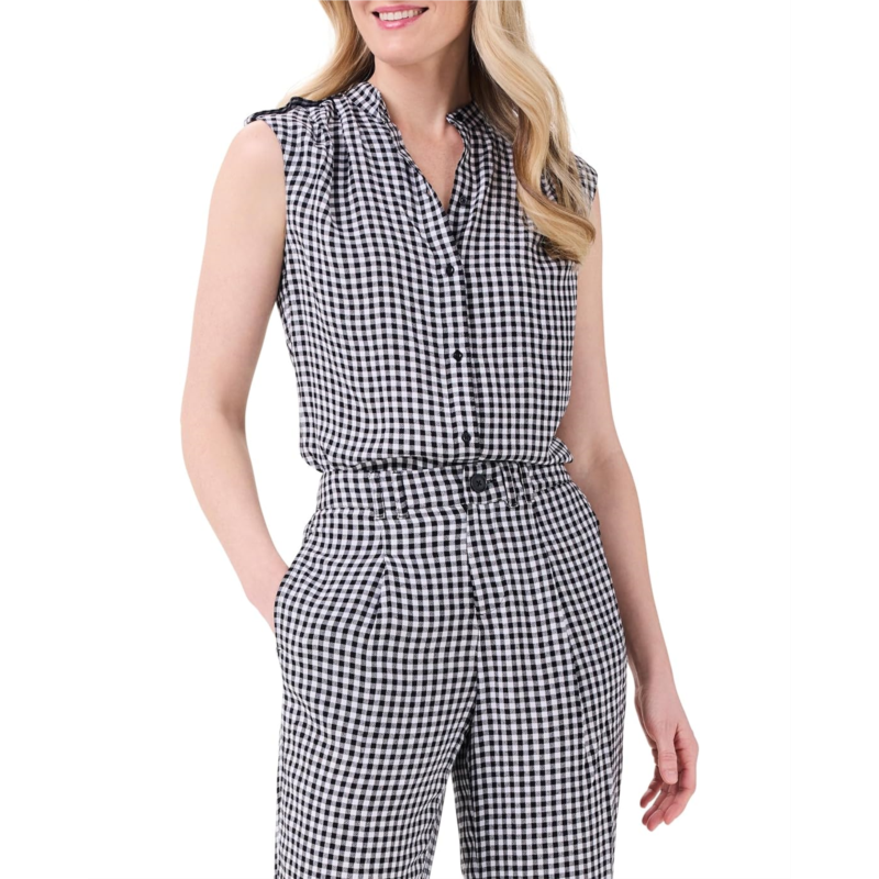 - Styled with a sleeveless design and stand collar, the NIC+ZOE Petite Drapey Gingham Tank makes a stylish addition to your wardrobe. The breathable viscose fabric of the tank makes it an ideal choice for your everyday wear. This printed top features a buttoned front closure that offers easy on and off. The ruching detail at the neck adds to its style. Perfect to pair with trendy denim or dress pants, this sleeveless top works for different occasions.