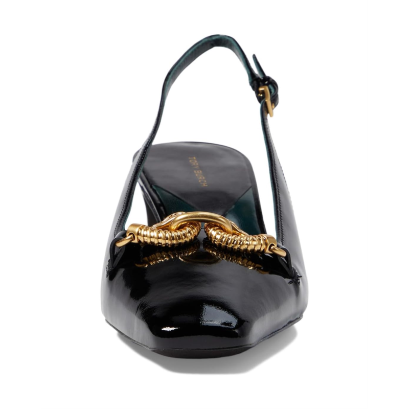 - Refine your look with the modern edge and sophistication of the Tory Burch 55 mm Jessa Slingback Heels. Sleek and incredibly chic, these shoes are beautifully ornamented with a metallic horsehead hardware. The squared toe and the sculptural block heel further add to the stylistic elements of this footwear.