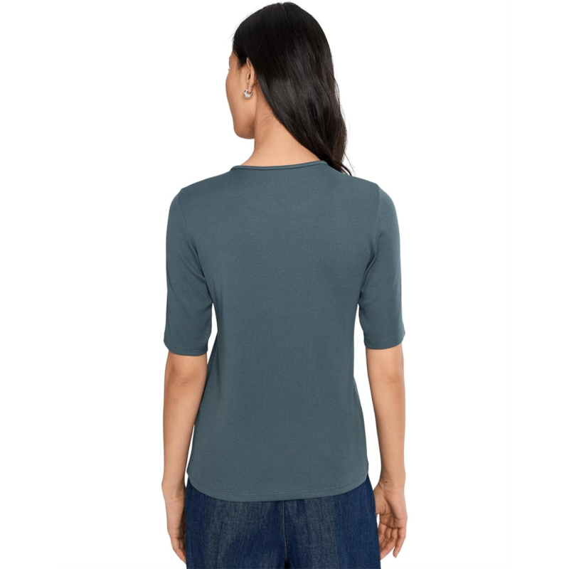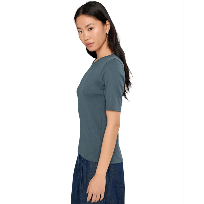 The EILEEN FISHER Organic Cotton Stretch Rib Crew Neck Top is crafted from a fine ribbed fabric with softness and stretch, offering elevated comfort for everyday basics. Designed with a crew neck and short sleeves, it is perfect for layering or wearing on its own. The fiber is sourced through regenerative farming methods that actively support soil health and biodiversity.