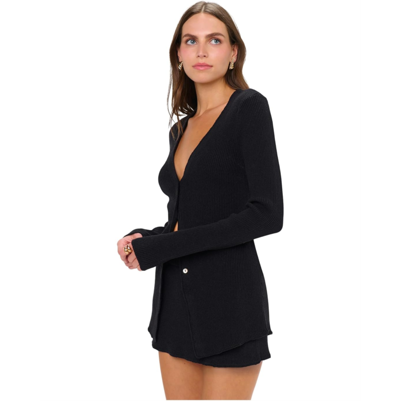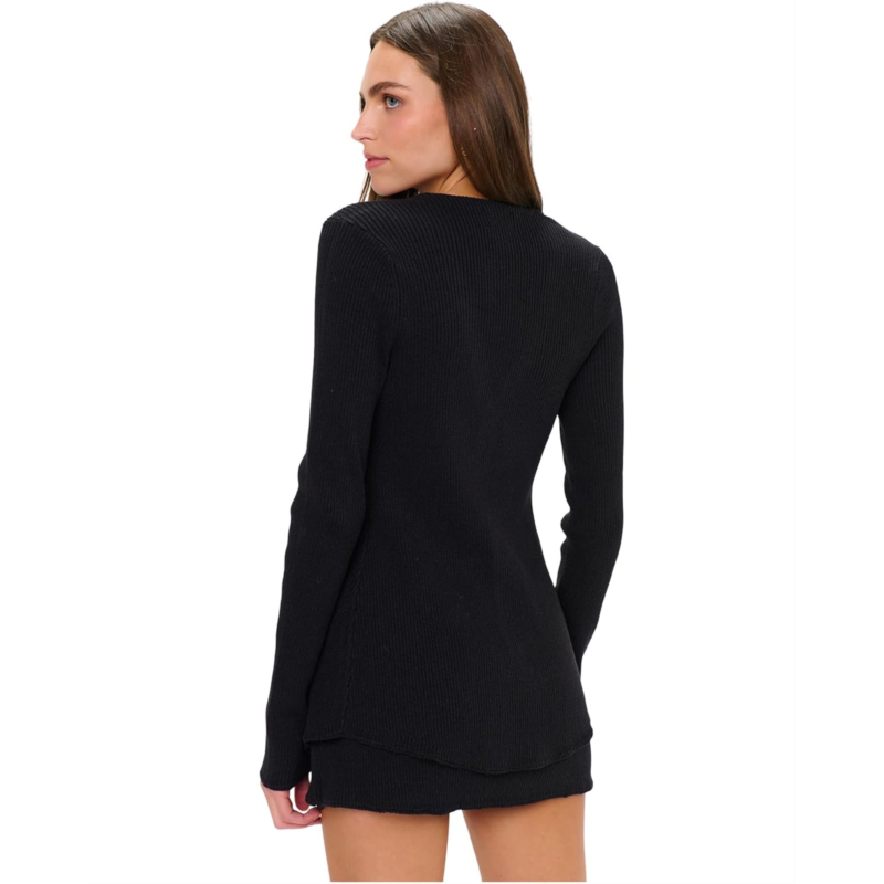 Meet your favorite new top, the simple and stylish Show Me Your Mumu Josie Top! The pull-on style top has a deep V-neck and button-front closure so you can show more or less skin. Made from a ribbed knit black sweater material, it features long sleeves and a slightly longer length. Shes comfortable, chic and flattering. Wear back to your favorite denim or matching Josie mini skort.