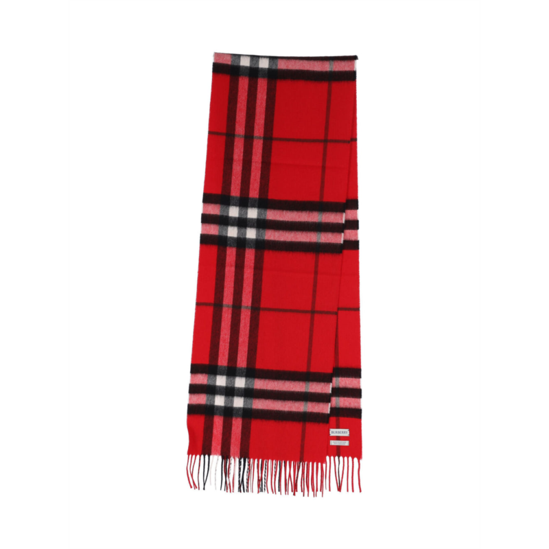 Indulge in the luxury of a scarf crafted from premium brushed cashmere, featuring a striking red canvas adorned with the iconic check pattern. Fringed ends and a discreet white logo label on the reverse add to its timeless sophistication and versatility, making it a perfect accessory for elevating any outfit. - Material - Premium brushed cashmere - Color - Striking red - Pattern - Iconic check - Ends - Fringed - Logo - Discreet white label on reverse