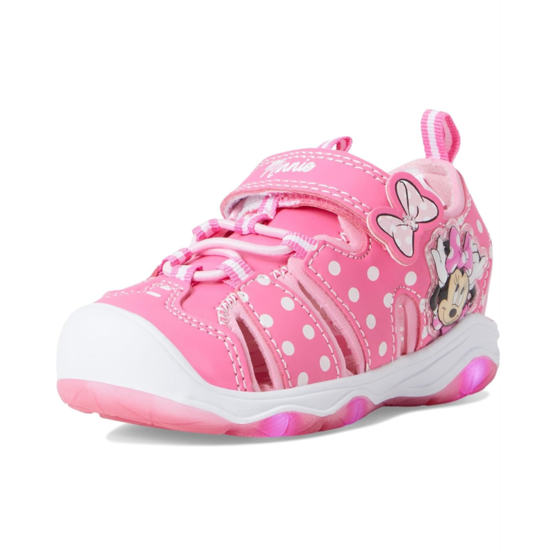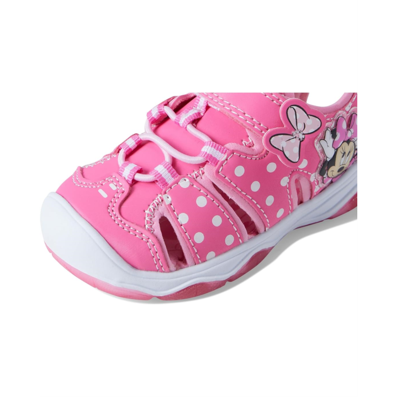 - The Josmo Minnie Mouse Fisherman Sandals are water-resistant sports sandals for kids that feature Minnie Mouse graphics and a light-up midsole. These printed sandals are designed with a lace-up closure and a hook-and-loop strap for a comfortable fit. They are crafted with a rubber upper, polyester insole, and neoprene lining. Get your kid ready for the outdoors wearing these flat sandals.