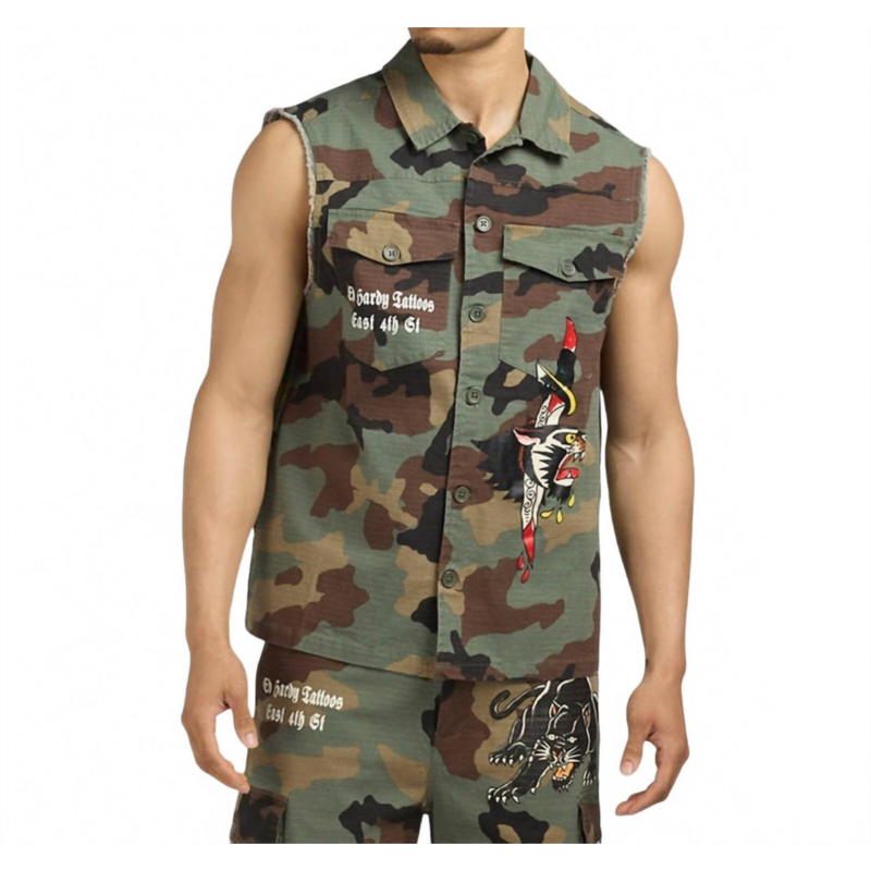 Unleash your style with the Panther Twill Jacket by Ed Hardy, designed to make you stand out with its unique camo pattern. This sleeveless jacket is crafted from durable twill material, reflecting a bold military and field aesthetic. Featuring a button closure and a classic collar neckline, it combines functionality with a striking panther design. Made for men''s spring fashion, this piece is complete with convenient pockets for added practicality.