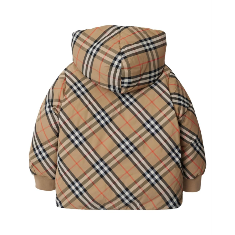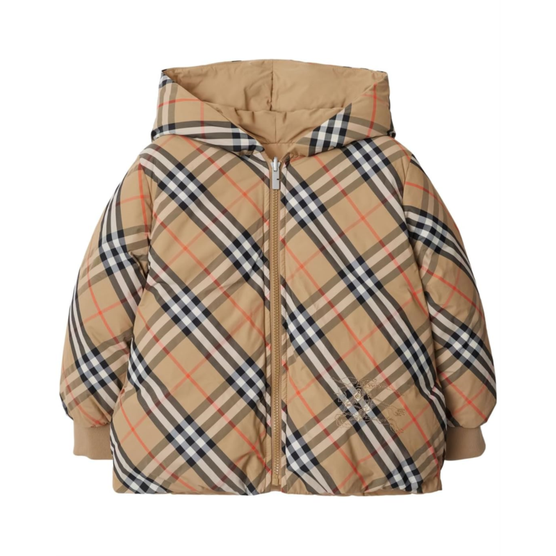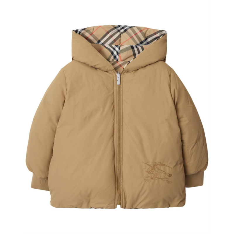 - The reversible Burberry Kids Axel Puffer features an embroidered Equestrian Knight Design on both sides, front zipper closure, long sleeves with ribbed cuffs, attached hood, side press-stud slip pockets, and a straight hemline.