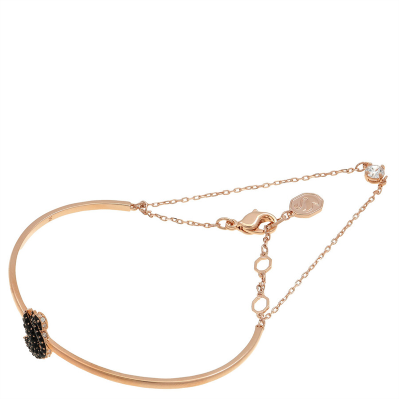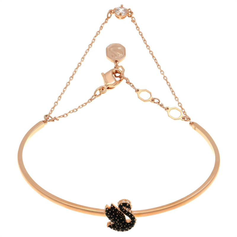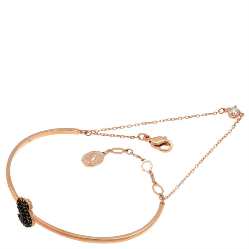Swarovski Bracelets. Color: Black/Rose gold-tone. Swarovski Black Swan Bangle. Crafted from rose gold-tone plating, this bracelet features a rigid band with an elegant swan motif, expertly decorated with a pave of jet black Swarovski ReCreated crystals. Material: Crystals, ReCreated Crystals, Rose gold-tone plated, Zirconia. Collection: Swan.