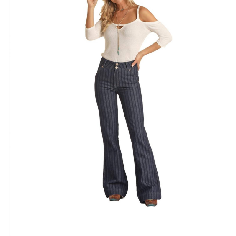 [US] Rock & Roll Denim jacquard high rise trouser jean in dark blue stripe