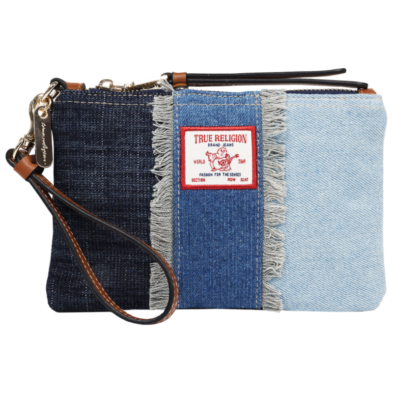 Elevate your everyday essentials with signature True Religion style. The True Religion Frayed Panel Denim Pouch blends iconic denim craftsmanship with modern functionality, creating the perfect grab-and-go accessory for day or night. Designed with multi-tone denim panels and raw frayed detailing, this pouch features the signature True Religion logo patch front and center for an unmistakable brand statement. A detachable wristlet strap with gold-tone hardware adds versatility, making it easy to carry solo or slip inside a larger tote.Compact yet spacious enough for your daily must-haves, this denim wristlet delivers effortless edge with premium finishing touches.-This True Religon Wallet is officially licensed. You are ensured to receive genuine and authentic merchandise.-7 wristlet strap length-Gold Hardware-Zip closure-True Religion Signature polyester lining-Interior, Backwall cash slip pocket-Material 50% Polyester+50% Cotton-Dimension - 5.5H X 8W X 0.25D-Weight 1 lbs.-Imported