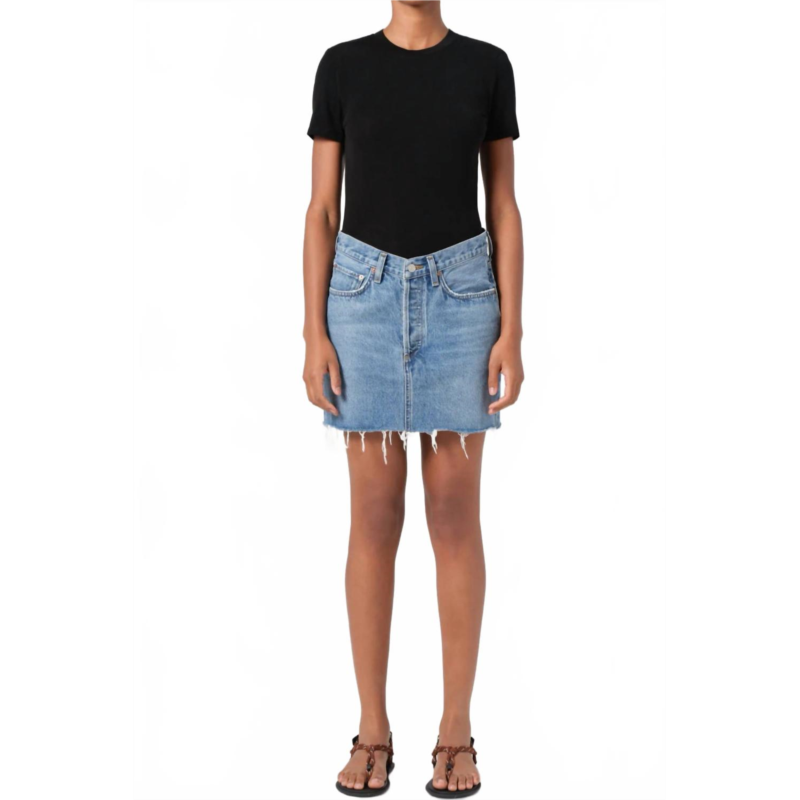 The perfect mini skirt does exist.Presenting the V-waist Mini Skirt by AGOLDE in the shade Fairway, a contemporary addition to any summer wardrobe. Featuring a flattering V-shaped waistband and a clean hem, this skirt boasts a relaxed fit for stylish comfort. Composition - 67% Regenerative Cotton, 22% Lyocell, 11% Post Consumer Recycled Cotton. Closure - Button closure. Care - Machine wash cold inside out with like colors, do not bleach, tumble dry low. Perfect for streetwear enthusiasts or back-to-school collections.