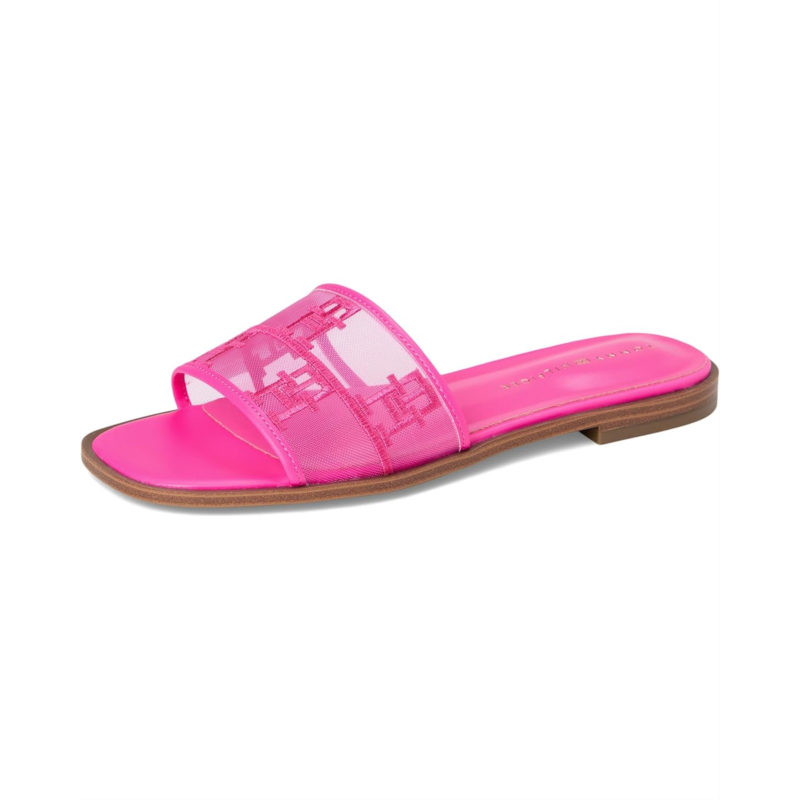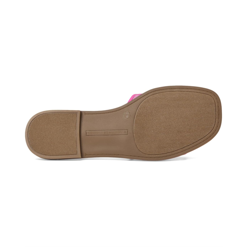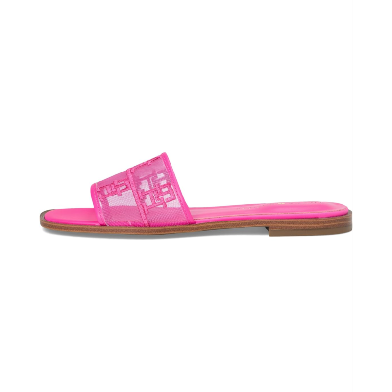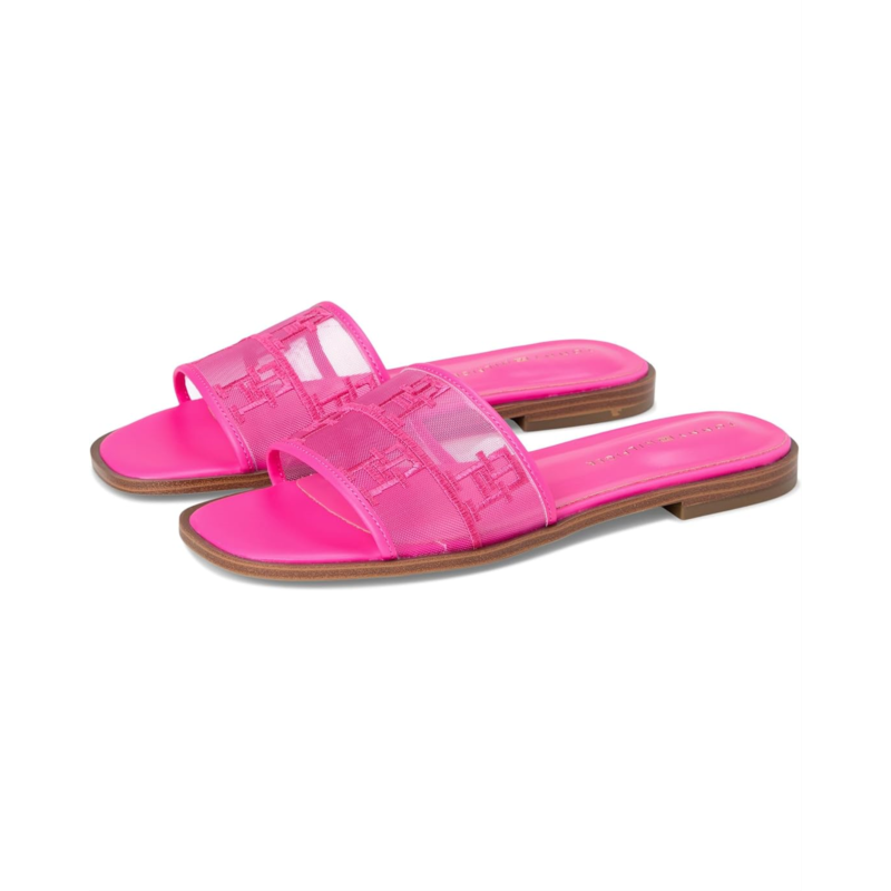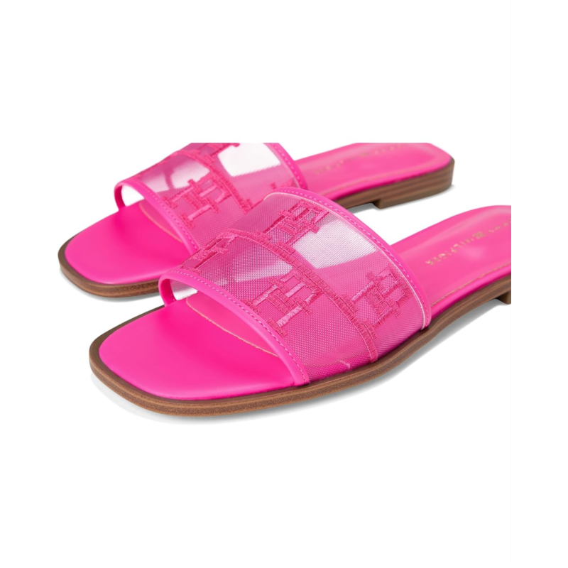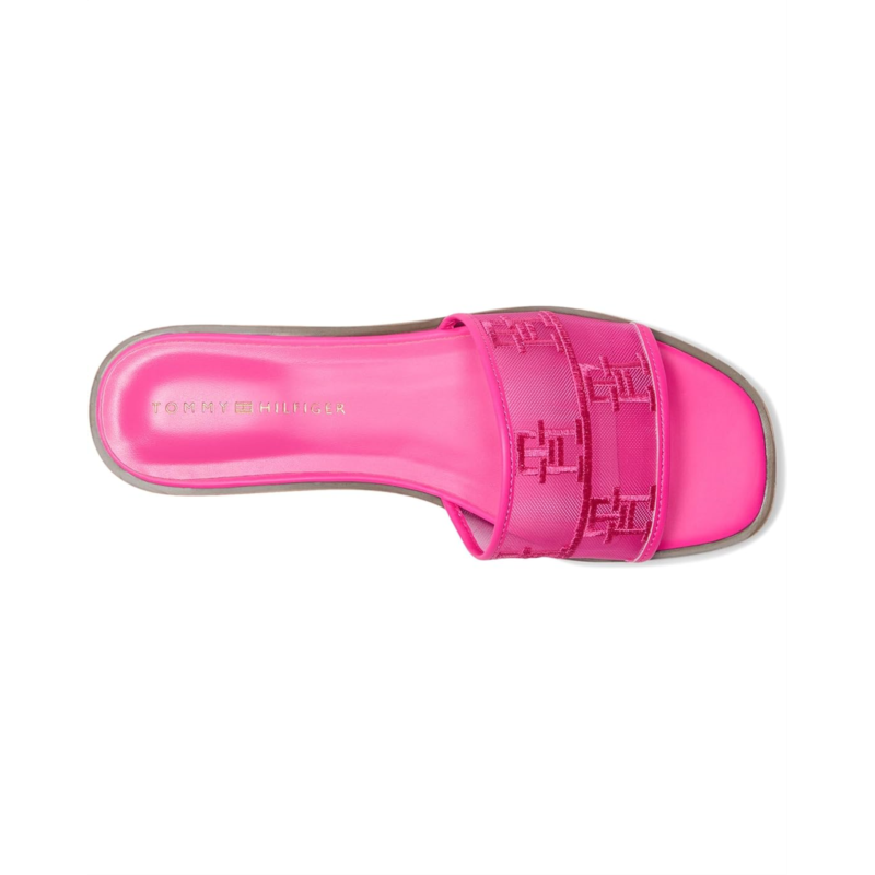 The Tommy Hilfiger Tesia Sandal with a mesh upper and signature logo detail amplifies the modern allure of a minimalist slide flat sandal, giving it breathability and a fresh look. The slip-on style sandal features a foam footbed for ultimate comfort and the slight block heel adds a little height to your look.