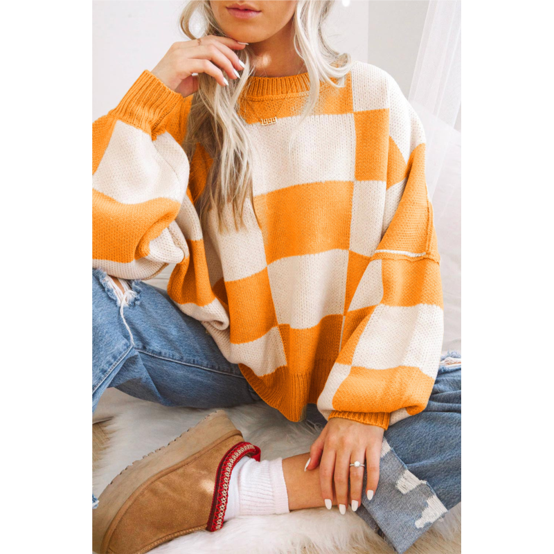 TRUEDAMES orange checkered bishop sleeve sweater