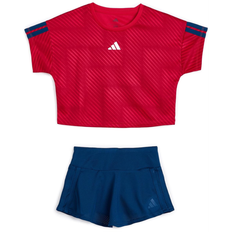 - Active days call for playful gear thats ready for adventure. Combining a top and shorts, the adidas Kids Aop Soccer Top Skort Set brings fun to the field and confidence to playtime. The soccer-inspired crew neck top features a fun all-over print and signature stripes, with short drop-shoulder sleeves creating a relaxed look while also allowing the arms to move extra freely. The mid-rise, flounced-hem skort delivers liberty to run, jump and climb, with built-in bike shorts providing coverage during energetic play. The wide, flat waistband helps keep the fit comfortable while making the garment easy for little hands to pull up. For clothing that keeps up with playground games, backyard tumbles and weekend outings, look no further than this pull-on style set. Blending bold design with breezy comfort, its an easy win in your childs wardrobe.