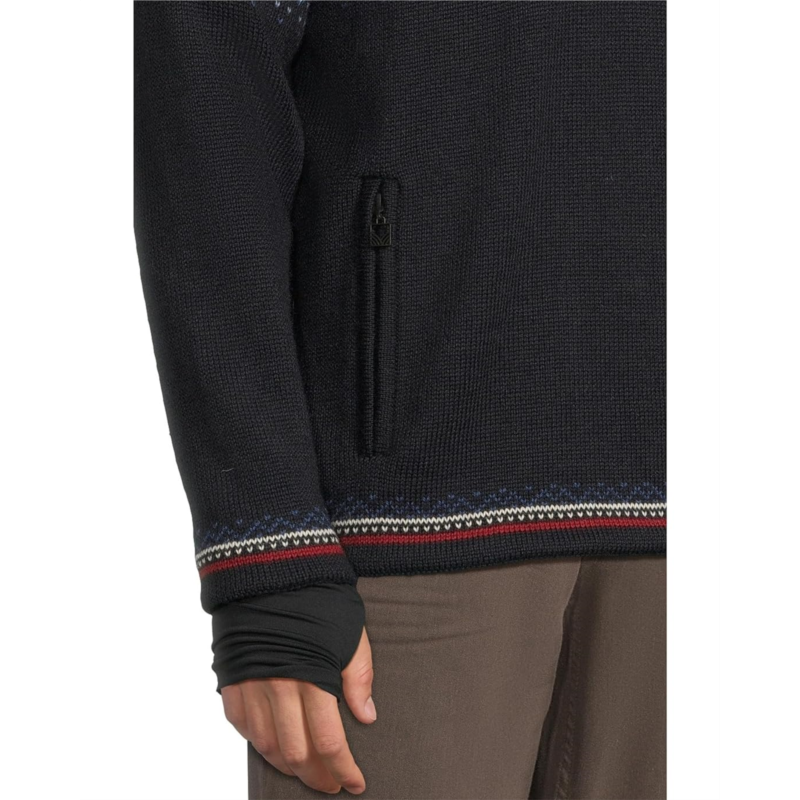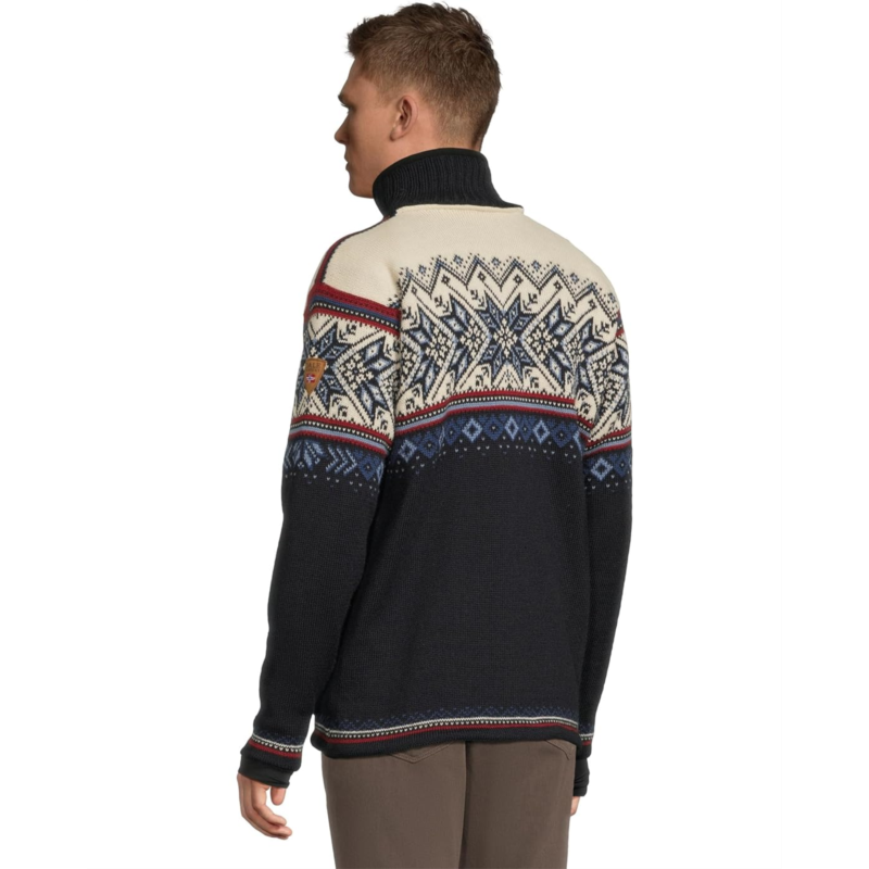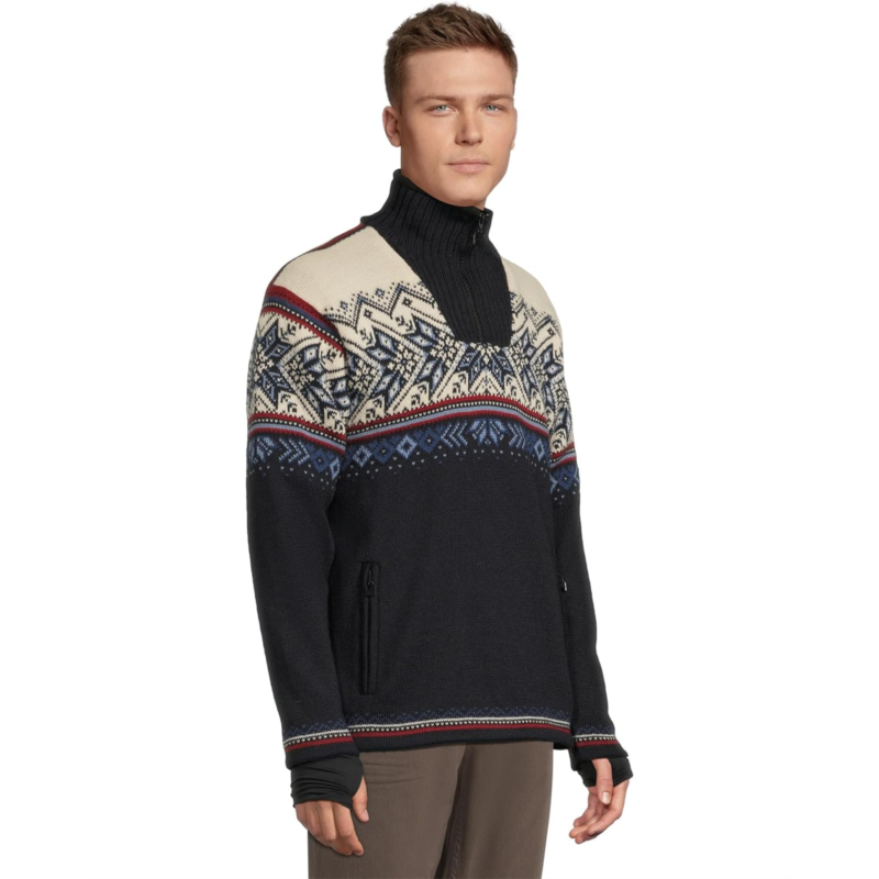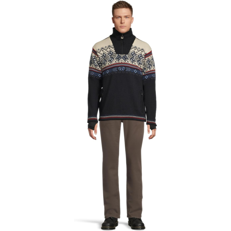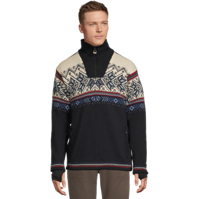 - A knit sweater in traditional winter sports styles to suit an active lifestyle, the Dale of Norway Vail WP Masc Sweater features a detailed 8-petal rose pattern with decorative winter elements. It is made from lightweight and long-lasting wool with premium knit quality for maximum comfort, softness, and strength. This warm and breathable woolen sweater comes with a windproof lining and is water-resistant. The quarter-zippered front placket, long sleeves, a med-high neckline, and a straight hem add to its style and comfort. Its stand collar is lined with fleece for added warmth. Ideal for both indoors and outdoors, this patterned sweater keeps warmth in and allows moisture to escape to keep you warm and dry all day.