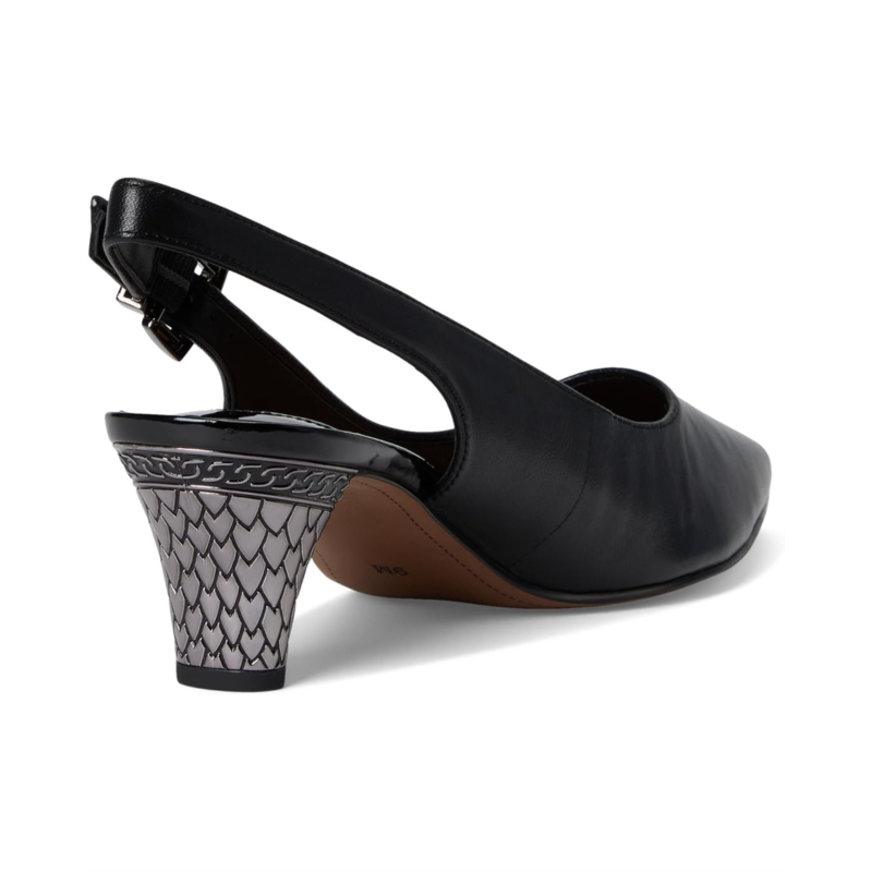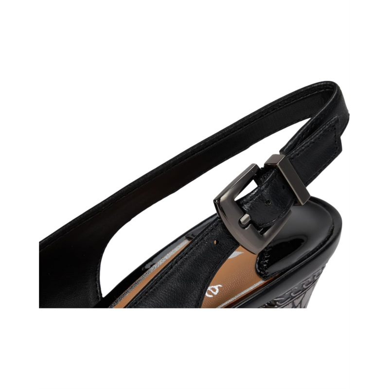 - Slingback strap with an adjustable buckle closure.