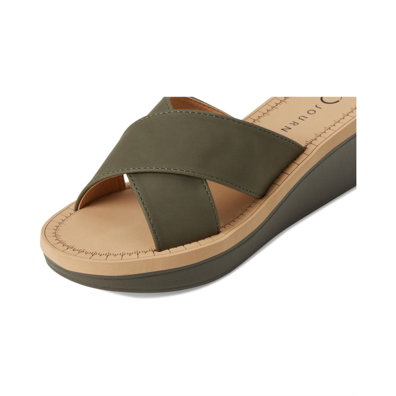 - The Journee Collection Biara wedge sandal offers effortless style and classic detail with its sculpted wedge heel and chic slip-on design. This sandal adds elegance to any look, featuring a faux leather upper with crisscross straps and an open round toe silhouette. The cushioned footbed ensures lasting comfort, making it perfect for all-day wear.
