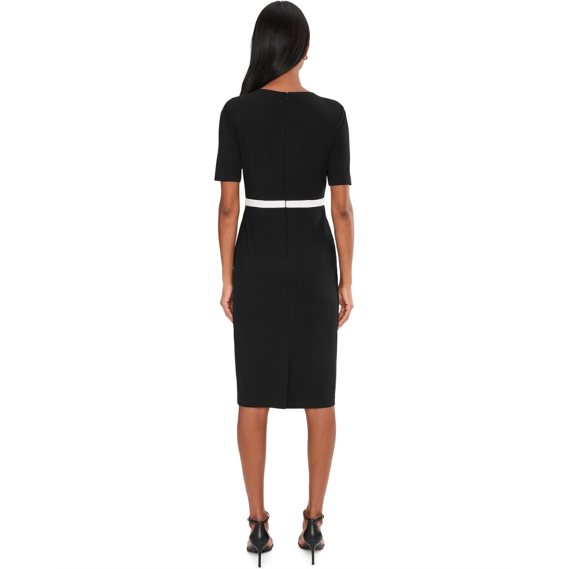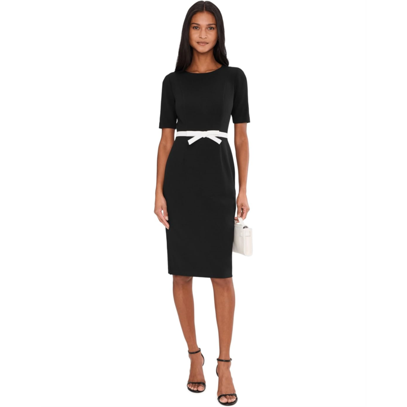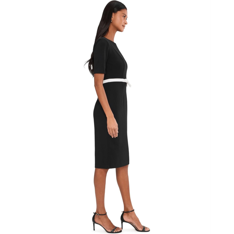 Cut in a classic sheath silhouette, this Adrianna Papell Contrast Bow Sheath Dress delivers timeless polish with a touch of charm. Its tailored from crisp knit crepe and sculpted with princess seams through the bodice and the knee-length skirt. A crew neckline and short elbow sleeves offer clean lines, while a thin contrast waistband with a front bow adds a sweet, retro chic finish. Its zippered back closure offers easy wear. This midi dress is an easy yet elegant choice for office meetings, business dinners, and daytime celebrations.