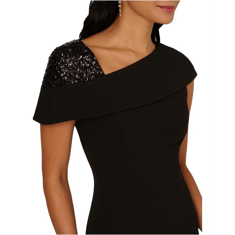 An architectural collar elevates this Adrianna Papell Beaded Crepe Midi Dress to a masterpiece. Cut from smooth crepe fabric, the structured sheath silhouette is shaped with princess seams and a mid-calf hemline for clean, elongating lines. A panel of sequins and beads glimmers at one shoulder beneath the asymmetrical fold-over neckline, adding subtle contrast and a hint of drama. It is styled with a zippered back closure, a straight hem, and an asymmetric neckline. Classic yet bold, this sharply-tailored midi dress is a refined option for milestone celebrations, elevated dinners, and formal occasions that call for sophisticated glamor.
