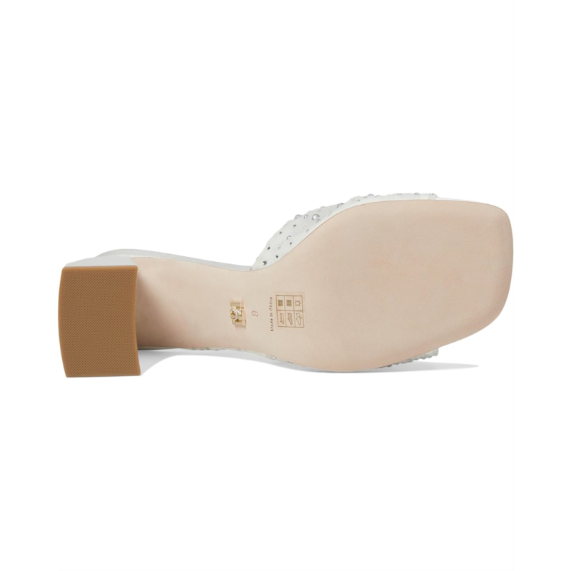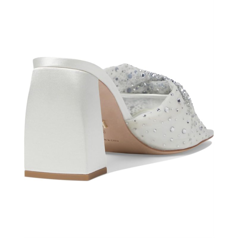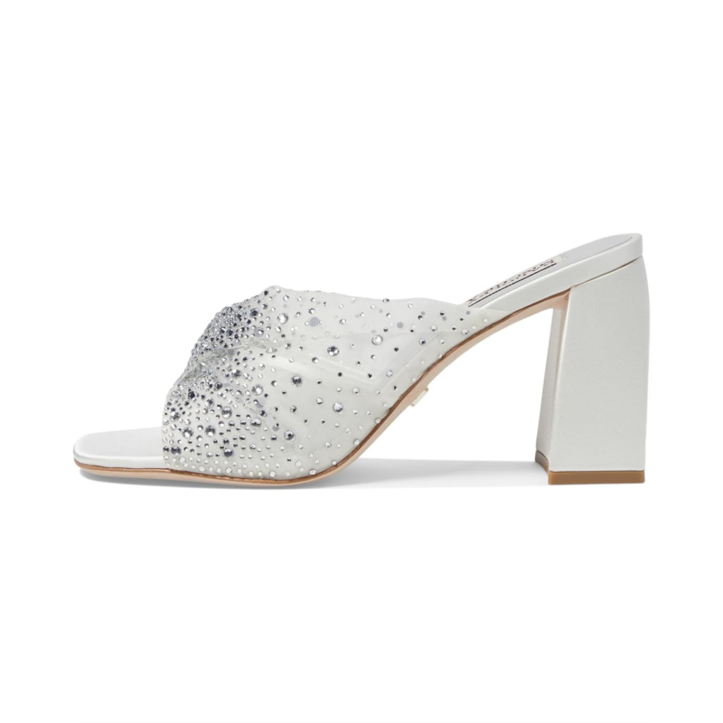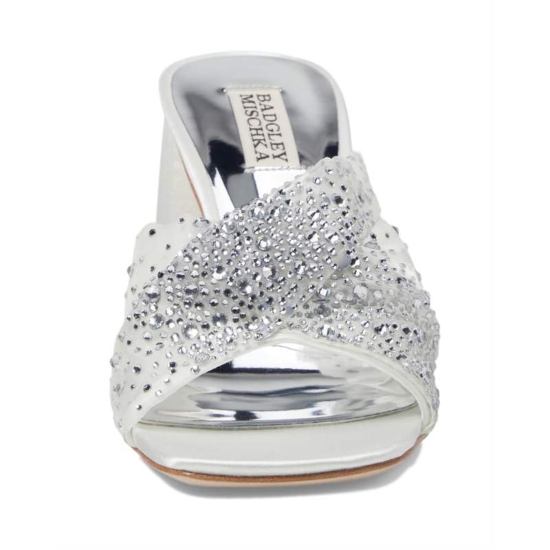 - Chic and cushioned, the Badgley Mischka Camelia sandals feature eye-catching rhinestone embellishment all over the strap that makes them an ideal choice to style up your outfits. The slip-on style of these heeled sandals offers easy on and off. From your cocktail dresses to evening gowns, these mule sandals are an ideal choice. Make a glamorous entry into any party or event by wearing these embellished sandals.