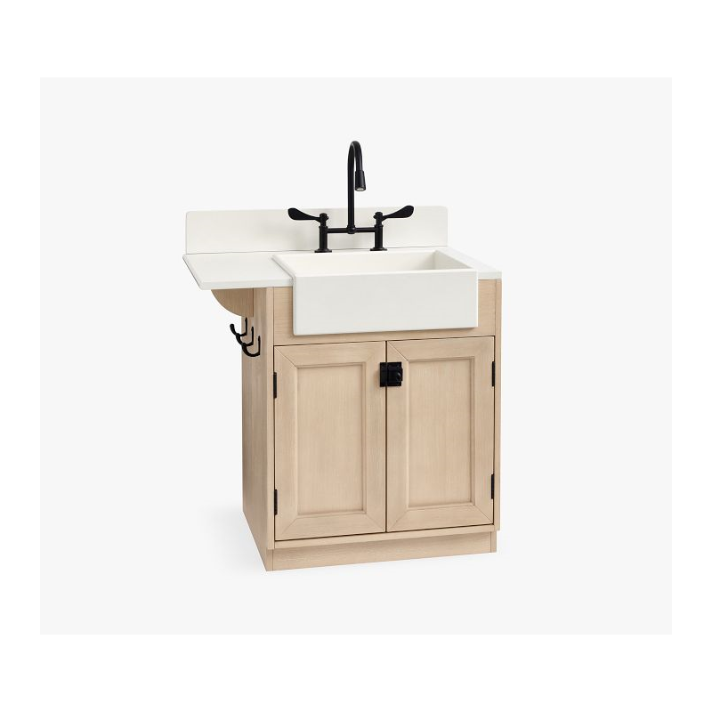- Sink features farmer’s sink, hooks on side for towels, area for dishes on top and doors with a roomy interior for storing items.